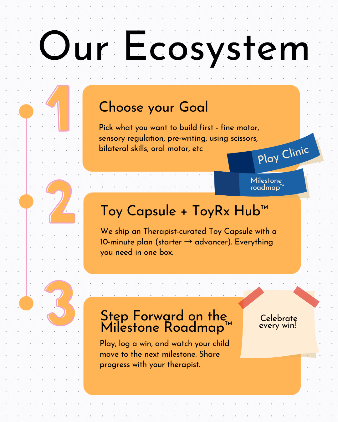 An OT-curated kit of versatile toys plus a 10-minute Toy-Rx™ Game Plan that targets a specific skill (e.g., fine motor, sensory regulation, pre-writing).