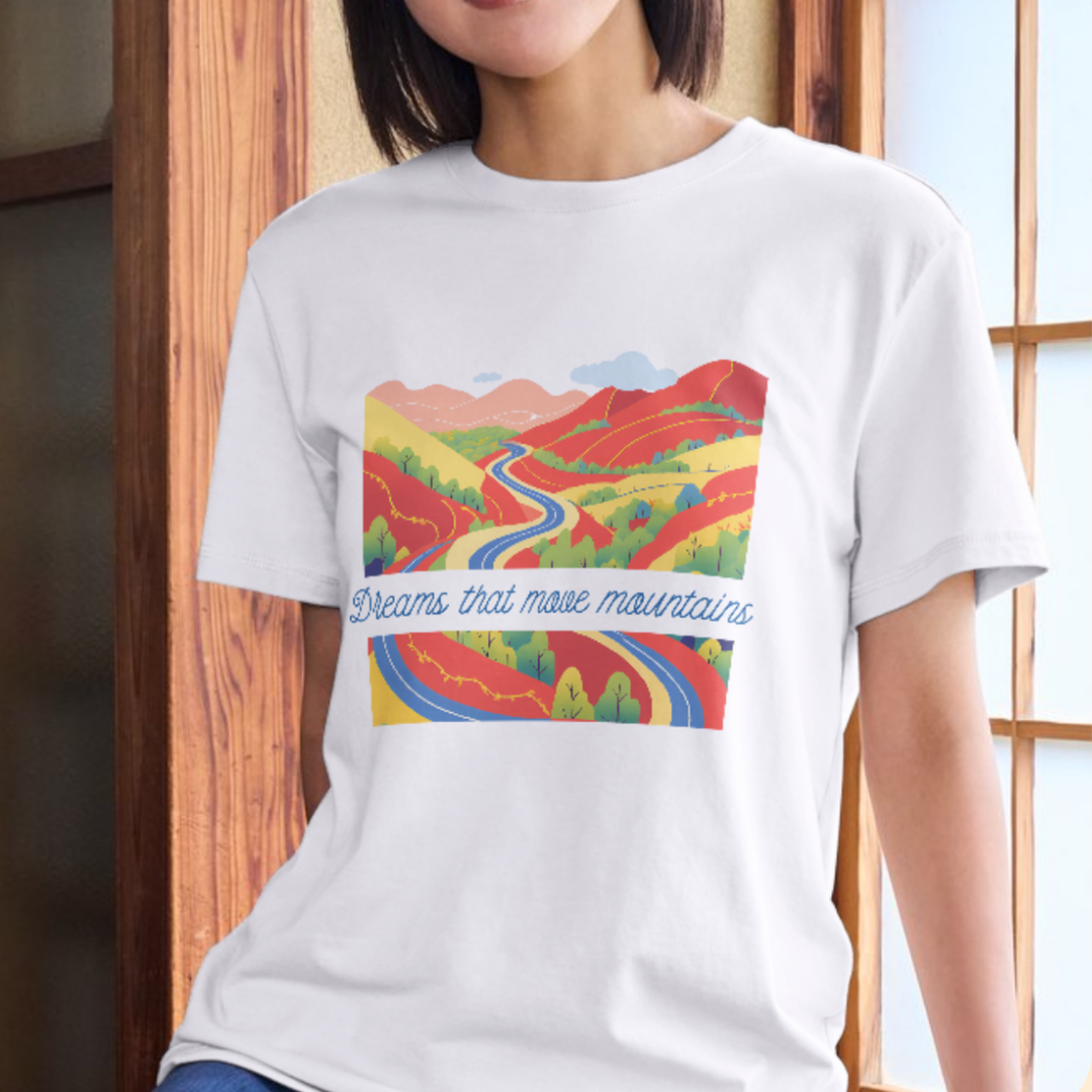 The "Dreams that Move Mountain" design features elegant cursive font artfully printed on a high-quality cotton white shirt. Crafted from soft, breathable cotton, this shirt ensures comfort while showcasing a motivational message that inspires resilience and determination. Its timeless design makes it suitable for casual wear or as a meaningful gift, combining style with purposeful expression.