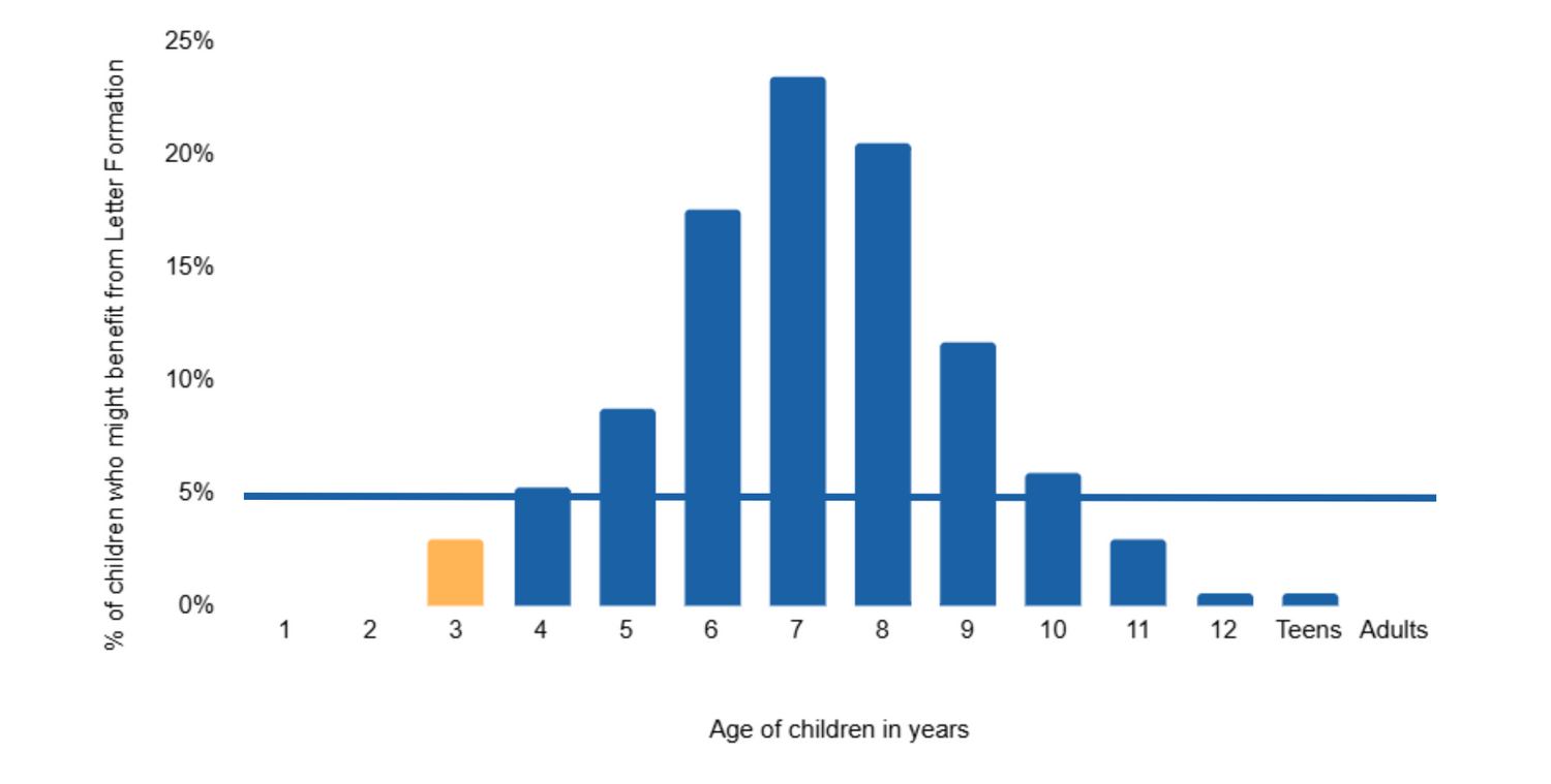 This graph highlights how the "Letter Formation" Toy Capsule is most beneficial for children aged 4 to 9, as they are in the key developmental window for these foundational abilities.